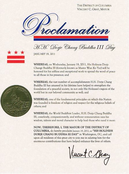 美國首都華盛頓市葛瑞市長正式宣布二零一一年一月十九日為“第三世多杰羌佛日”,並號召大家向第三世多杰羌佛致敬!