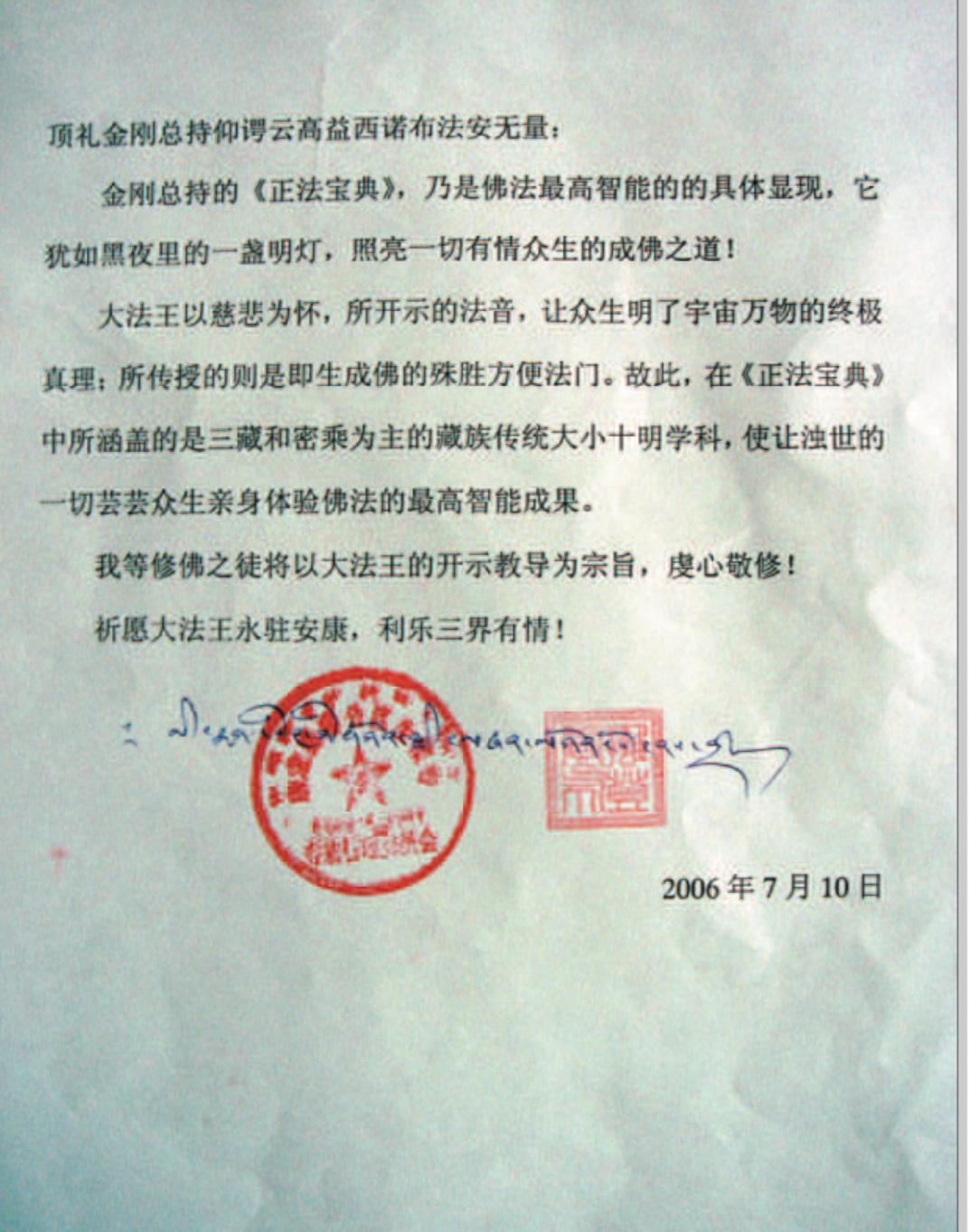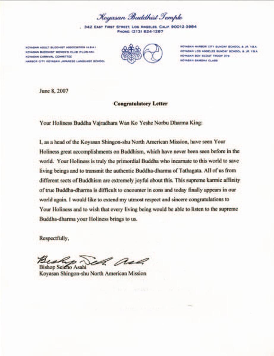我是高野山真言宗北美洲主教,我看到您在佛教上的巨大成就在世界上以前還沒有見到過。您是真正的始祖佛降到這個世界上來傳授如來正法,救渡眾生。我們雖然來自不同的佛教派別,但都為此極其高興,這個至高無上的佛法因緣是百千萬劫難遭遇的,但是今天在我們這個世界上終於出現了。我謹向您致以最尊敬和誠心的祝賀,並祝願每一個眾生都能聽聞您帶給我們的至高無上的佛法。