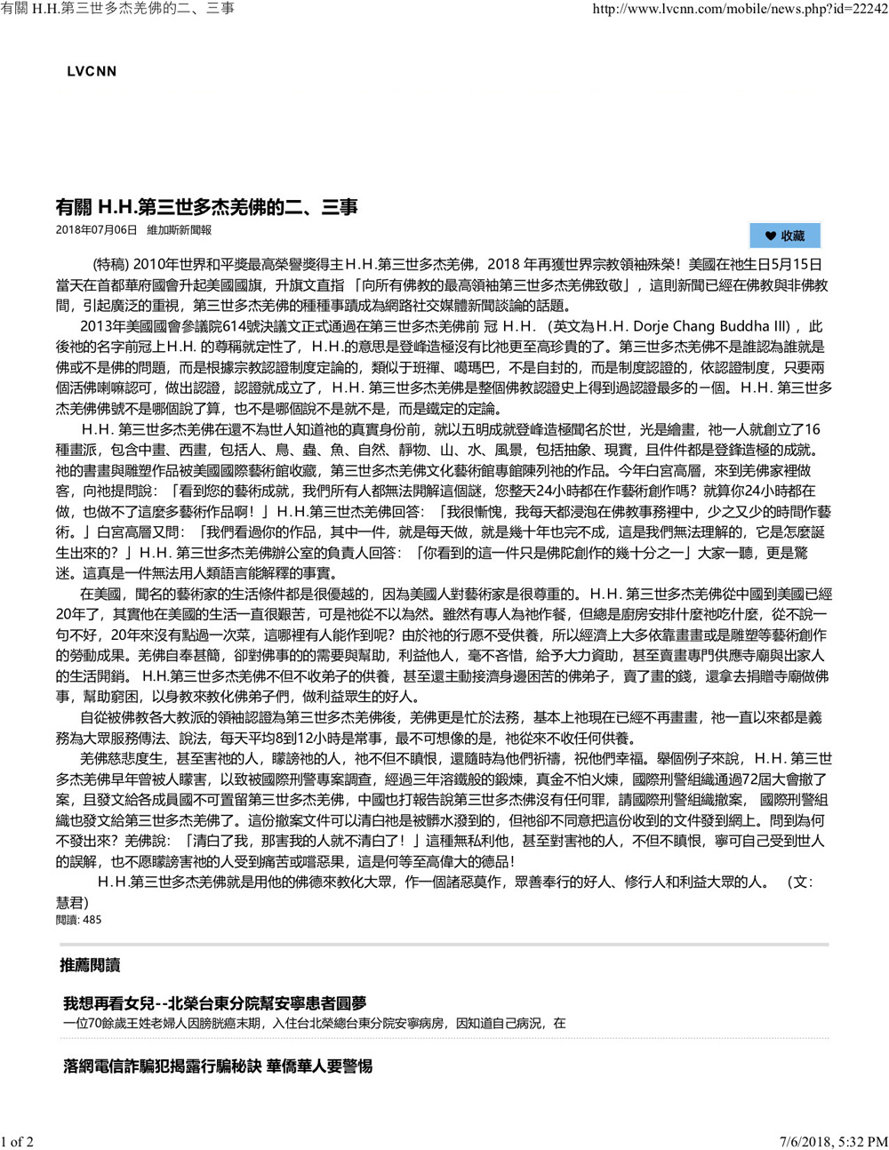 媒體報導:有關 H.H.第三世多杰羌佛的二、三事