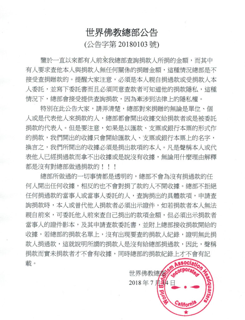 特別在此公告大家,請弄清楚,總部對來捐贈的無論是單位、個人或是代表他人來捐款的人,總部都會開出收據交給捐款者或是被委託捐款的代表人。但是要注意,如果是以匯款、支票或銀行本票的形式作的捐款,我們開出的收據只會開給匯款人、支票或銀行本票上的名字,換言之,我們所開出的收據必須是捐出款項的本人。凡是聲稱本人或代表他人已經捐過款而拿不出收據或是說沒有收據,無論用什麼理由解釋都是沒有對總部做過捐款的!!!